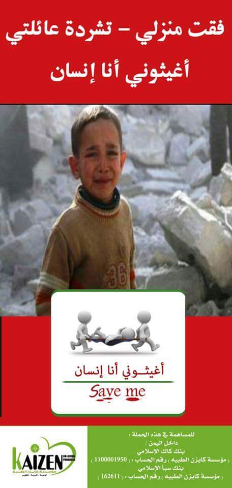 انطلقت اليوم بالعاصمة صنعاء حملة " اغيثوني انا ـ انسان " التي تتبناها مؤسسة كايزن الطبية، حيث تهدف هذه الحملة الى توفير اماكن آمنه وبعيدة عن النزاع المسلح والحروب وتوفير الخدمة...