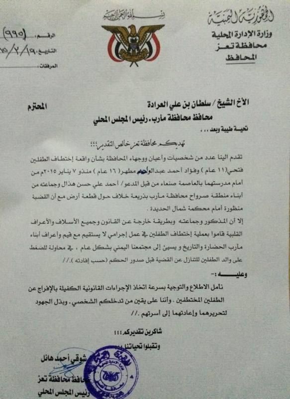 وجه محافظ تعز شوقي أحمد هائل مذكرة الى محافظ مأرب الشيخ سلطان بن علي العرادة بشأن اختطاف الطفلين فتحي (11 عام ) وفؤاد أحمد عبدالواحد مطهر( 16 عام ) منذ 7 يناير 2015م من أمام...
