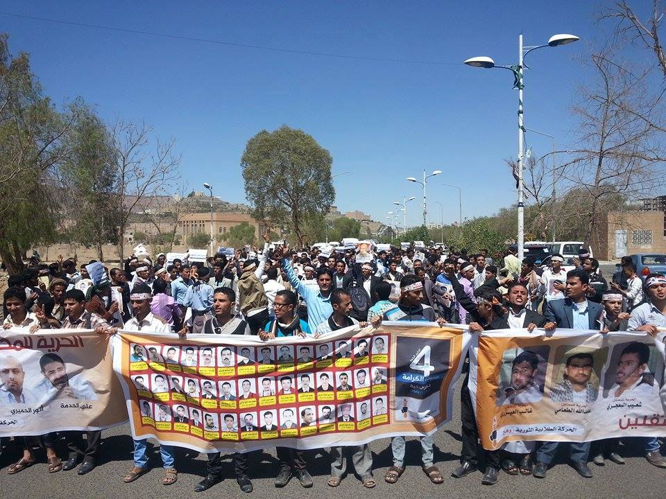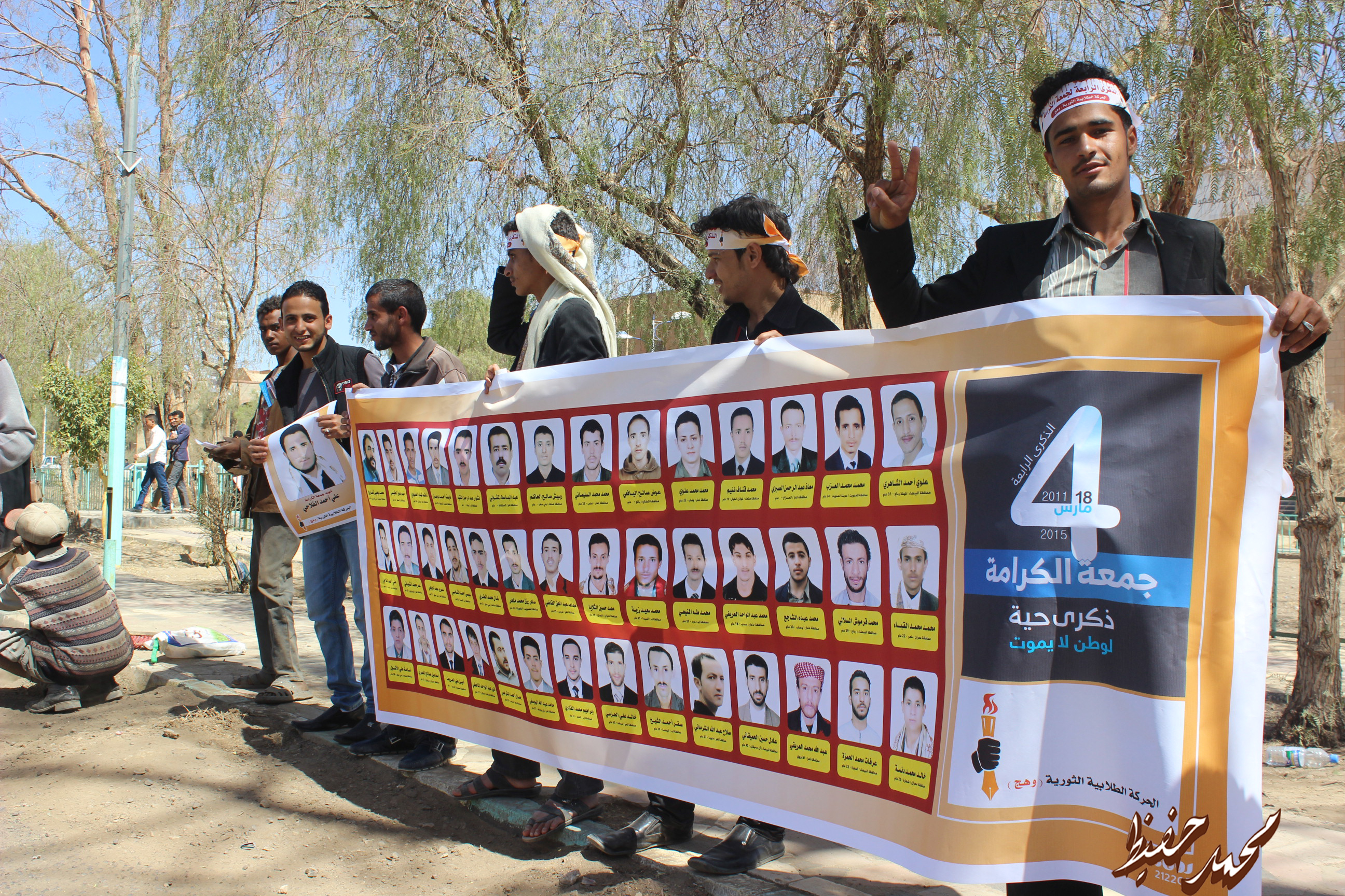 نفذ اليوم المئات من طلاب جامعة صنعاء سلسلة بشرية طويلة ، كما قاموا بمسيرة جابت العديد من الكليات داخل الجامعة وذلك إحياء للذكرى الرابعة لجمعة الكرامة والمطالبة بسرعة محاكمة...