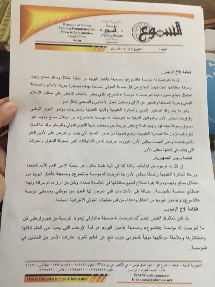 ناشدت مؤسسة الشموع للصحافة والاعلام وصحيفة أخبار اليوم رئيس الجمهورية عرض قضيتها وما تعرضت وتتعرض له من انتهاكات جسيمة من قبل مليشيات الحوثي على مجلس الأمن والأمين العام للأمم...