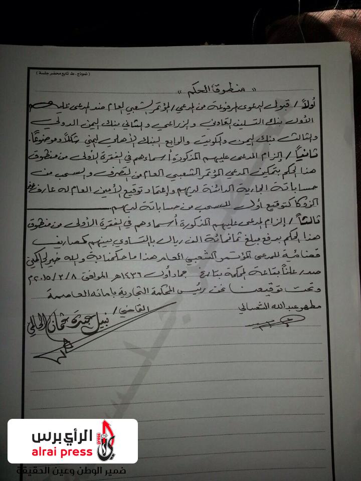 قضت المحكمة التجارية في أمانة العاصمة باعتماد توقيع الامين العام للمؤتمر الشعبي العام عارف الزوكا بالتوقيع على الشيكات الخاصة...