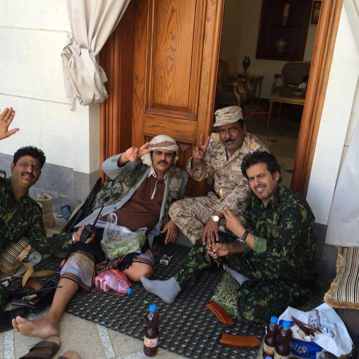 تظهر الصورة الاحمر وهو جالس على كرسي في مكتب والإبتسامة ترتسم على وجهه فرحاً بفك الحصار عن هادي وفكاكه من قبضة الحوثيين...