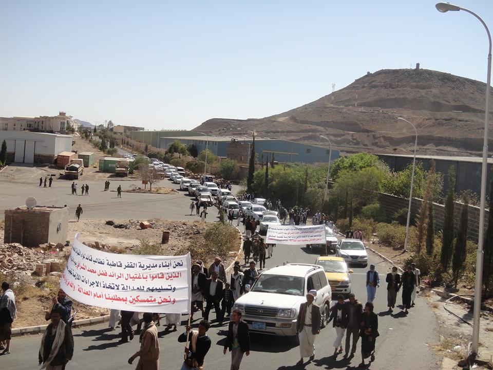 الآف من أبناء مديرية القفر يحتشدون في منطقة الصباحة للمطالبة بتسليم المسلح الحوثي قاتل الشهيد الشرفي