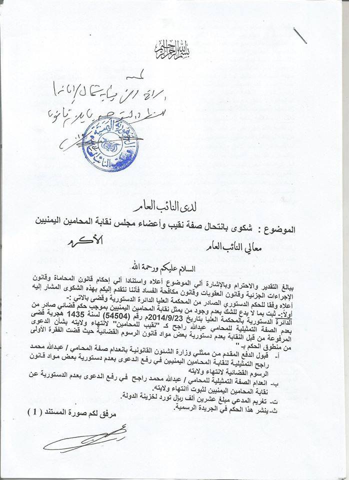 تقدم المحامي ربيع عدنان عثمان والمحامي اشرف البيضاني بشكوى الى النائب العام ضد منتحلي صفة نقيب المحامين واعضاء مجلس النقابة المحامين اليمنيين .جاء في الشكوى ان المحامي عبدالله...