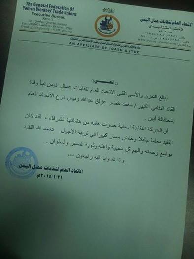نعى الاتحاد العام لنقابات عمال اليمن وفاة المناضل النقابي الكبير – محمد خضر عزلق عبدالله – رئيس فرع الاتحاد العام بمحافظة...