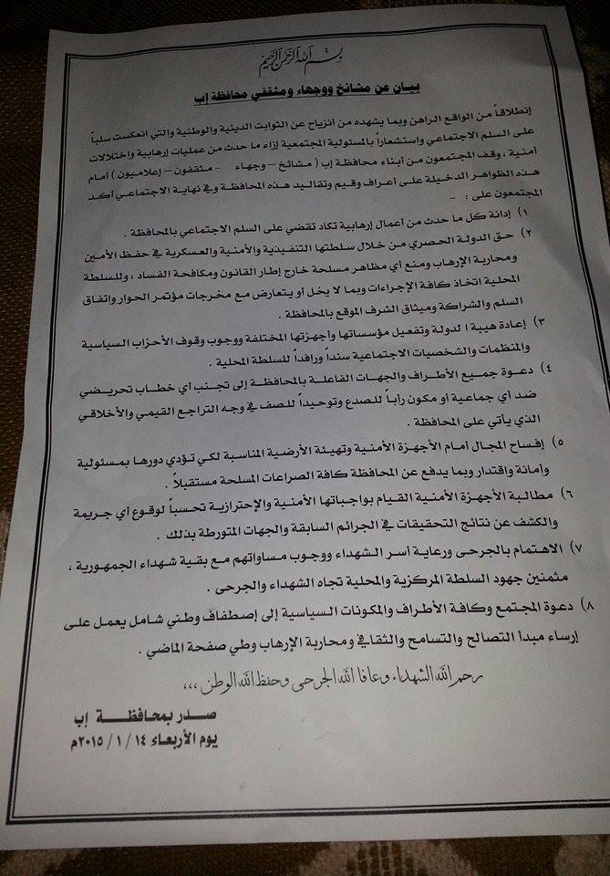 عقد اليوم مشائخ ووجهاء واعيان ومثقفون واعلاميون محافظة إب ،اجتماع وصف بالهام ، جرى خلاله الوقوف أمام الاوضاع الأمنية المتردية التي تعيشها المحافظة منذ عدة اشهر وأنعكاسات ذلك...