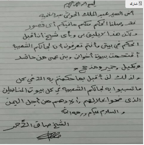 كتب الشيخ حسين عبد الله بن حسين الأحمر منشورا على صفحته في موقع التواصل الإجتماعي "فيس بوك" عبر فيه عن حزنه وتعازيه في وفات صديقه محمد عبد الإله...