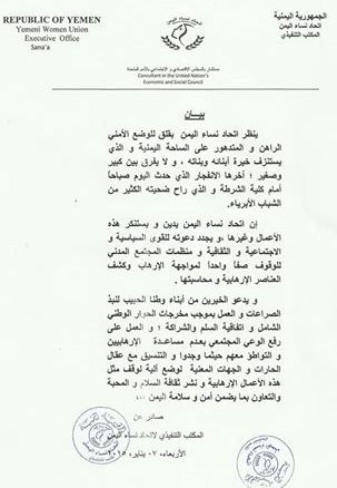 أدان المكتب التنفيذي لاتحاد نساء اليمن بشدة "الجريمة الارهابية النكراء التي حدثت صباح اليوم أمام كلية الشرطة بصنعاء وأدت الى سقوط عشرات الشهداء والجرحى"...