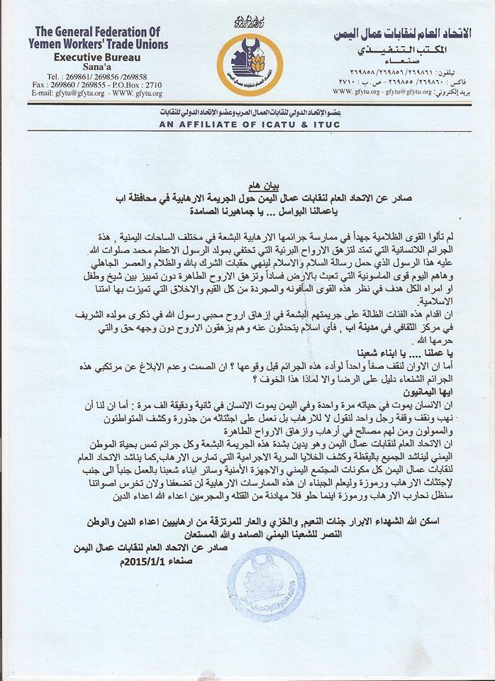 اصدر الاتحاد العام لنقابات عمال اليمن بيان إدانة واستنكار جراء ما تعرض له المحتفلين بالمركز الثقافي بأب بالمولد النبوي على صاحبه أفضل الصلاة وأزكى التسليم والذي أستهدف أكثر من 33...