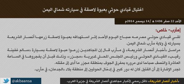 نقل موقع تنظيم "أنصار الشريعة" التابع لتنظيم القاعدة في جزيرة العرب على حسابه الخاص في موقع التواصل الاجتماعي "تويتر" للتغريدات القصيرة بياناً قال فيه إن قيادياً حوثياً لقي مصرعه...