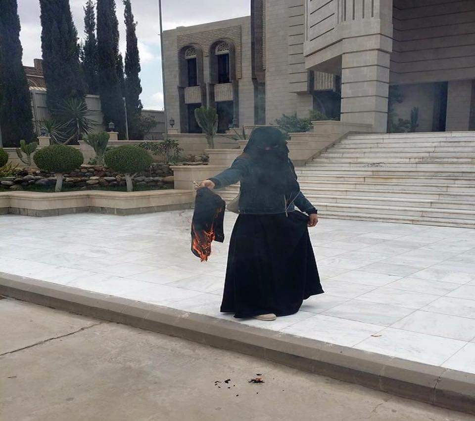 يمنية تحرق حجابها في ساحة الوزراء لهذه...