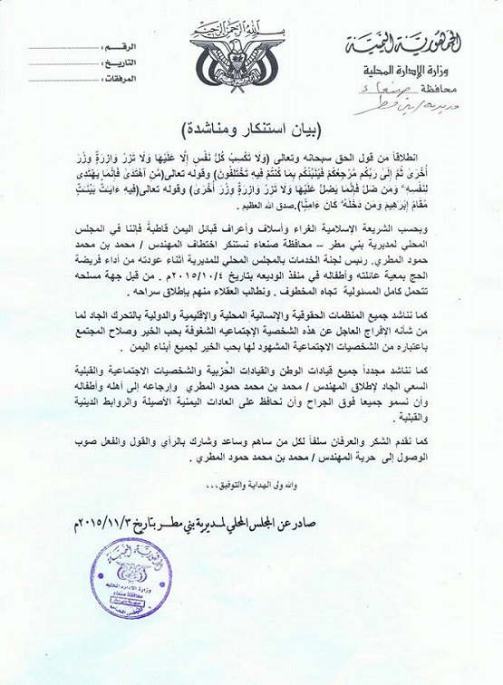 استنكر المجلس المحلي لمديرية بني مطر اختطاف المهندس / محمد بن محمد حمود المطري رئيس لجنة الخدمات بالمجلس المحلي للمديرية أثناء عودته من أداء فريضة الحج بمعية عائلته وأطفاله في...