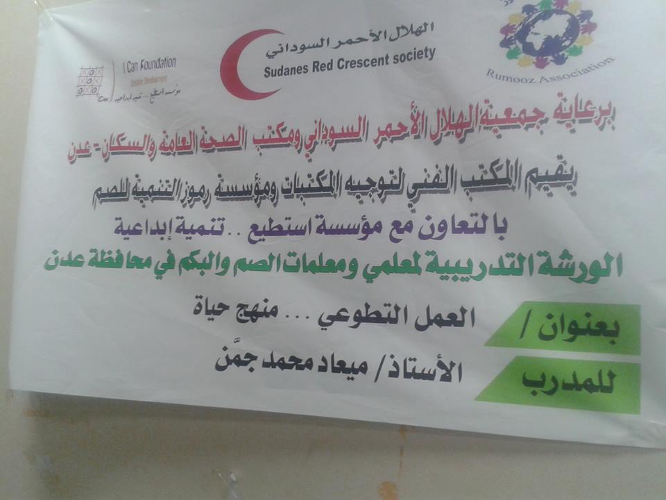 برعاية جمعية الهلال الأحمر السوداني ومكتب الصحة العامة والسكان – عدن أقام المكتب الفني لتوجيه المكتبات ومؤوسسة رموز التنموية للصم بالتعاون مع مؤوسسة أستطيع .. تنمية إبداعية ،...