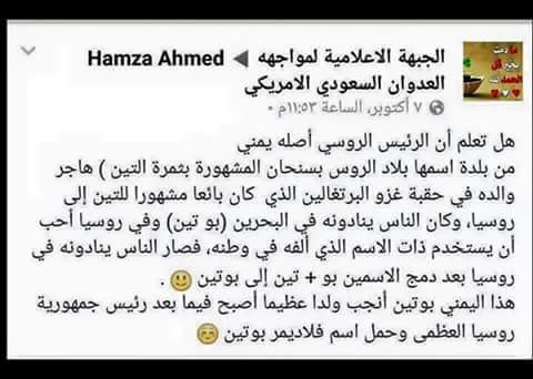 تداول ناشطون على صفحات موقع التواصل الاجتماعي "فيس بوك" منشورات زعموا انها نقلا عما تسمى بالجبهة الاعلامية لمواجهة العدوان السعودي افادوا فيها ان الرئيس الروسي فلاديمير بوتين من...