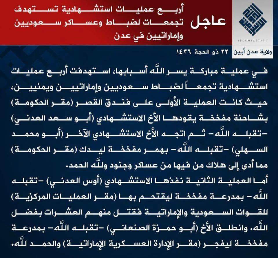 نشر تنظيم الدولة الإسلامية ولاية عدن “داعش” صور وأسماء منفذي تفجيرات عدن على حسابه في تويتر مؤكدا قيامهم بعمليات استشهاديه حسب بيان نسب للتنظيم استهدفت قوات التحالف ومقر...