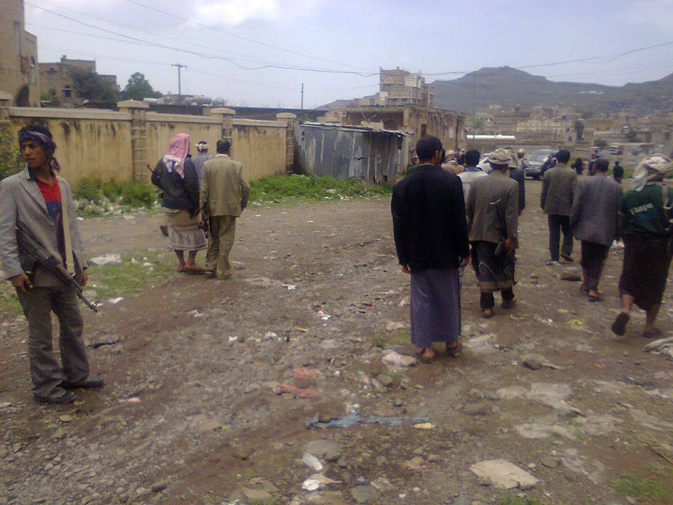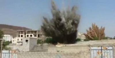 يظهر في الفيديو لحظة سقوط الصاروخ على حي جامعة الإيمان الذي استهدفته المقاتلات وسقط على منزل سكني بالخطأ وخلف عدد من القتلى والجرحى...