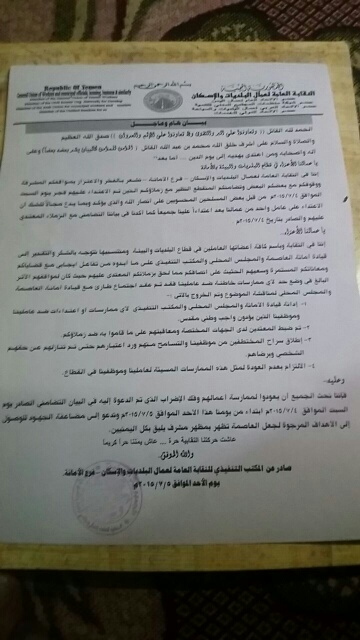 عاود عمال النظافة بأمانة العاصمة لمباشرة اعمالهم اليوم الاحد بعد ان اعلنت النقابة العامة لعمال البلديات والاسكان فرع الامانة عن انهائها للإضراب الذي دعت اليه عمالها السبت الماضي,...
