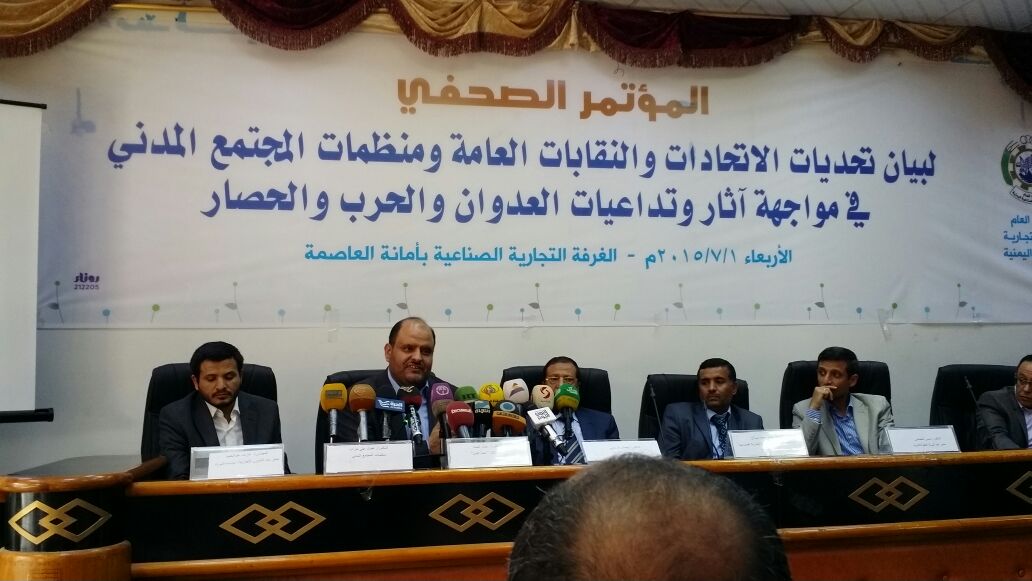 عقدت عدد من منظمات المجتمع المدني والاتحادات والنقابات العامة اليوم الاربعاء مؤتمرا صحفيا بالغرفة التجارية والصناعية بأمانة العاصمة لبيان التحديات التي تواجهها في ظل مواجهة اثار...