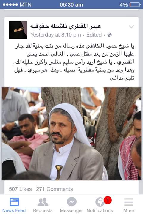 يا شيخ اريد راس.... واكون حليلة لك.. وهذا وعد من يمنية مقطرية اصيلة ..وهذا هو مهري.. فهل تلبي...