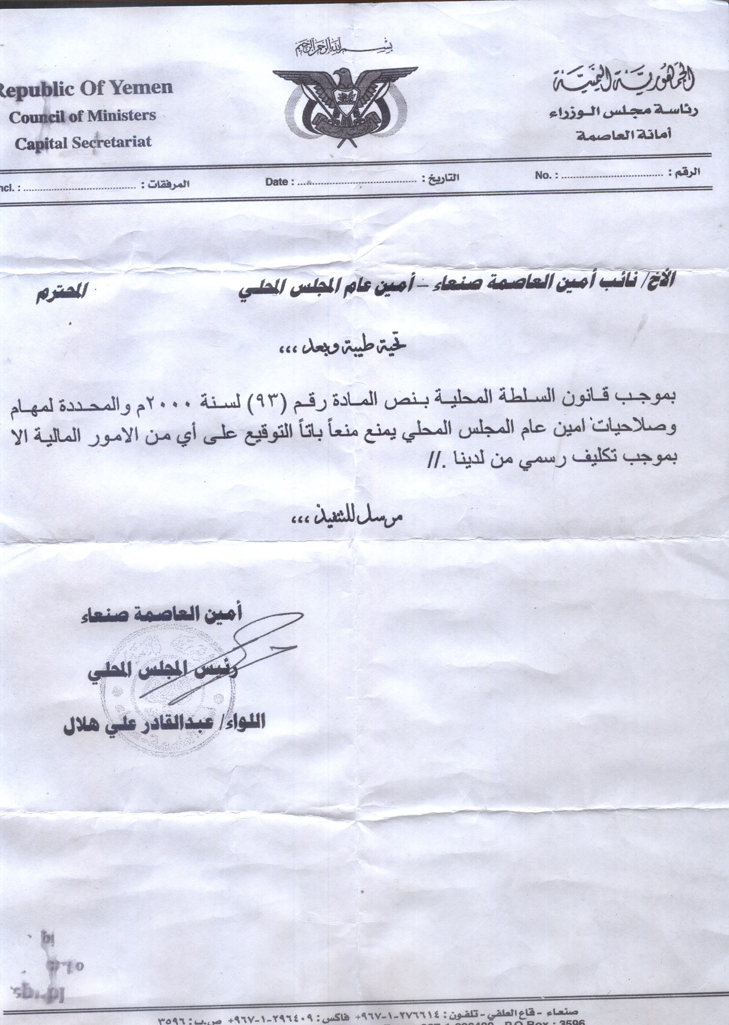 اكدت مصادر مطلعه بأمانه العاصمه صنعاء لــ ( الراي برس) بأن أمين العاصمة رئيس المجلس المحلي اللواء / عبد القادرعلي هلال وجه نائبه أمين عام المجلس المحلي بالأمانه أ/ أمين جمعان بعدم...