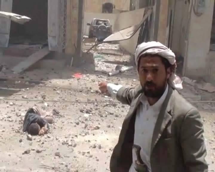 تداول عدد من نشطاء مواقع التواصل الإجتماعي صورة مؤلمة تظهر مواطن يمني وهو يشير الى جثة أبنة المقتول في أحد الشوارع ومنزله المدمر الذي تأثر من شدة...