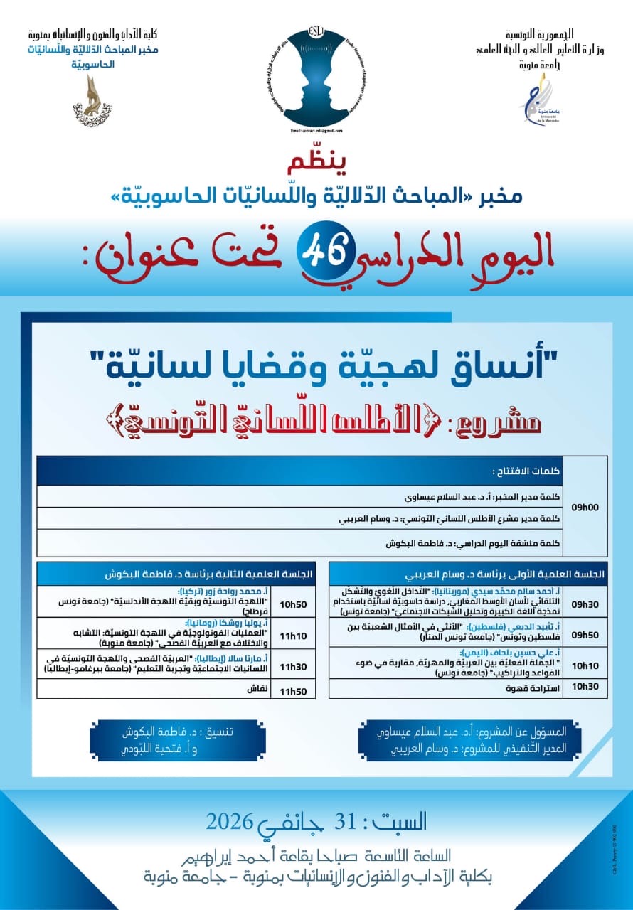 نظّم مخبر المباحث الدلاليّة واللّسانيّات الحاسوبيّة، يوم أمس الأول السبت 31 يناير 2026، بكلّية الآداب والفنون والإنسانيّات بمنّوبة (تونس)، يومًا دراسيًّا بعنوان : أنساق لهجيّة وقضايا لسانيّة، وذلك في إطار سلسلة اللقاءات العلميّة المرتبطة بـ مشروع الأطلس اللّسانيّ التونسيّ، وهو مشروع علمي يهدف إلى إنجاز قاموس لهجيّ خاصّ باللهجة التونسيّة، يتميّز بالاختلاف نوعًا وكمًّا وعلى مستوى منهجيّة العمل وطريقة العرض، مقارنة بالأعمال المعجميّة السابقة.